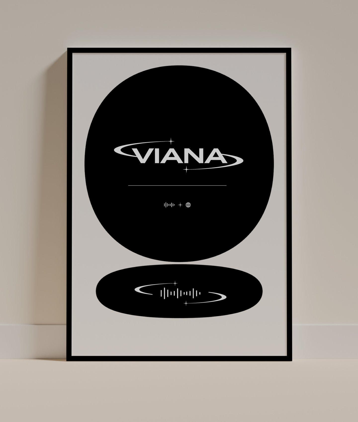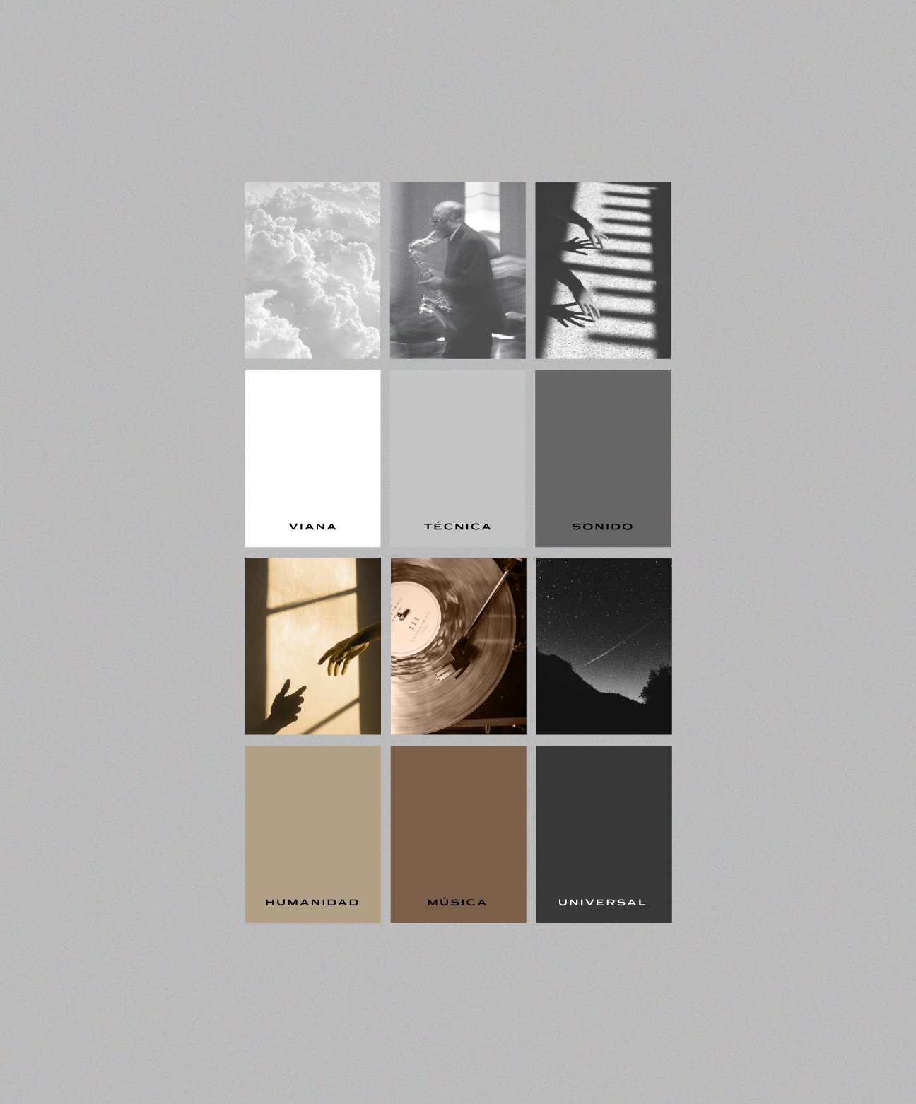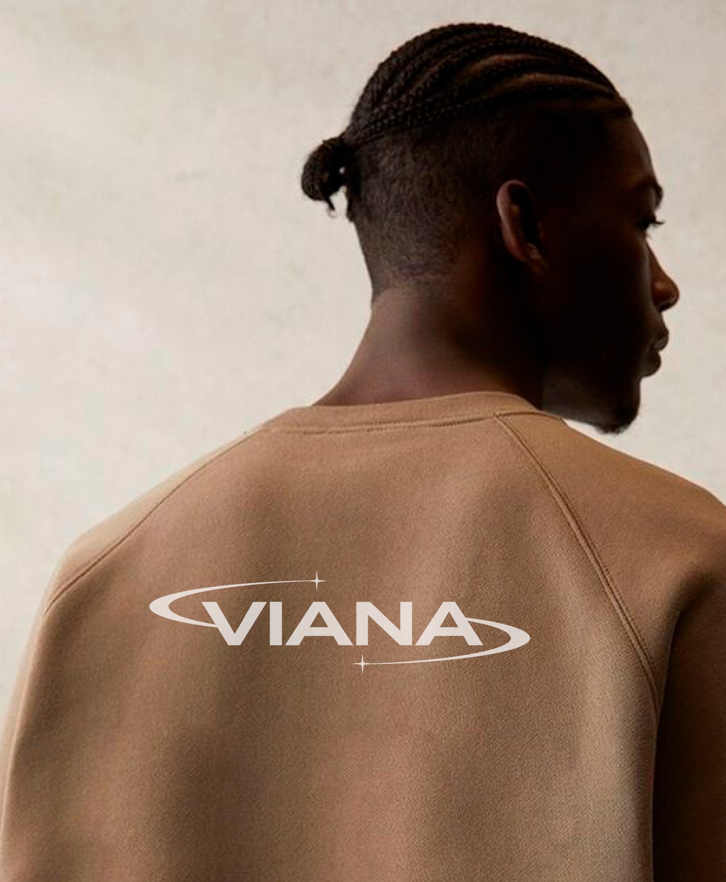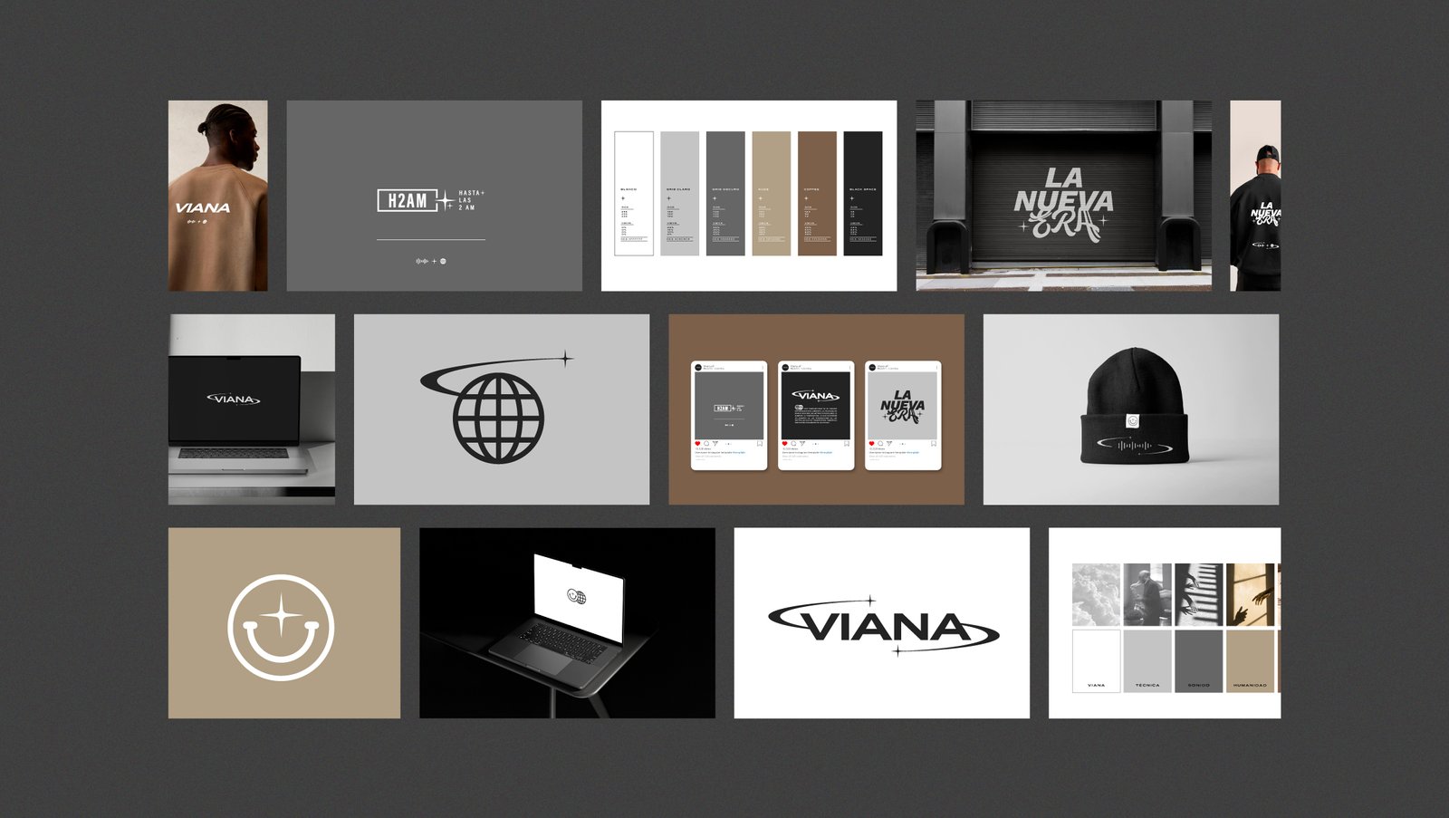Logotipo: El logo presenta una tipografía futurista con trazos curvos y geométricos que evocan dinamismo y energía, típicos del reguetón. El uso de un óvalo alrededor del nombre "VIANA" sugiere movimiento, algo constante en el estilo de vida de un artista y en los ritmos vibrantes del reguetón. Tipografía: La tipografía principal, "LP Horizont," es clara y sólida, ideal para destacar el nombre del artista en diferentes plataformas. Se acompaña de una fuente secundaria más fluida, reflejando versatilidad, como la de un cantante capaz de adaptarse a distintos ritmos y estilos. Colores: La paleta de colores, que incluye tonos neutros como negro, blanco, beige y marrón, otorga una estética sobria pero sofisticada. Estos colores también transmiten una sensación de madurez y seriedad, destacando al artista como una figura relevante y establecida dentro de la industria. Iconografía: Los símbolos adicionales como el globo terráqueo y el smiley (carita sonriente) conectan con una identidad global y positiva. Representan el alcance internacional de la música de VIANA y el impacto emocional de su arte en la audiencia. Aplicaciones: La identidad visual está implementada de manera coherente en prendas de vestir, accesorios, redes sociales, y escenarios urbanos, elementos esenciales para construir una conexión con la base de fans del reguetón, caracterizada por su apego a la moda y la cultura de la calle.